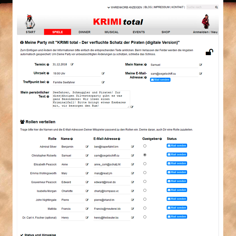 Nun trägst Du die Namen aller Spieler in die Übersicht ein. Du kannst natürlich auch selbst mitspielen. Wähle Dir eine Rolle aus und klicke dahinter auf Gastgeber. Nach Eingabe der Mailadressen sendest Du jedem Mitspieler direkt seine persönliche Einladung. Mit der Einladung erhält jeder von euch einen Link zur App und seine persönliche Spiel-ID. Mit dieser Spiel-ID lädt sich jeder Gast seine persönliche (geheime) Rollenbeschreibung auf sein Handy.