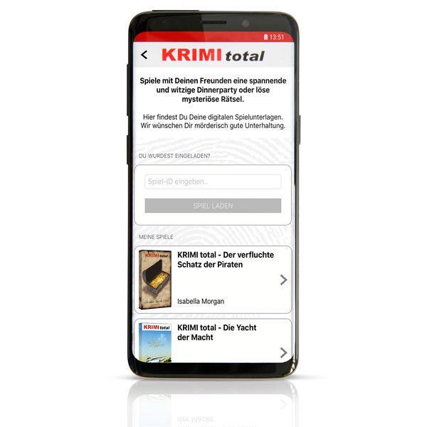 So geht es zum Spielbereich: Starte die KRIMI total App und klicke oben links auf den Würfel. Kopiere Deinen Spiel-ID aus Deiner Einladungs-Mail in das entsprechende Feld. Nun klicke auf “Spiel laden”. Unter dem Feld erscheint nun Dein Spiel. Mit einem Klick gelangst Du ins Spiel und kannst Deine geheime Rollenbeschreibung lesen. Bei Deinen Freunden ist zusätzlich eine Kurz-Anleitung zum Spiel enthalten.